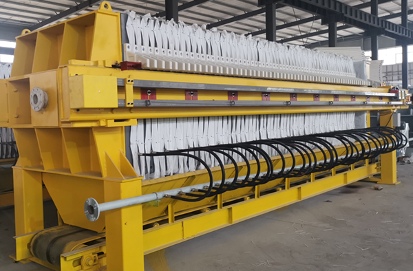 隔膜壓榨壓濾機是由隔膜板和廂式濾板排列組成濾室,在輸料泵的壓力作用下將料漿輸入濾室,通過過濾介質(濾布)將料漿中的固體和液體分離,當料漿中的固體形成餅后,再向隔膜通入空氣,對濾室內的固體充分壓榨。